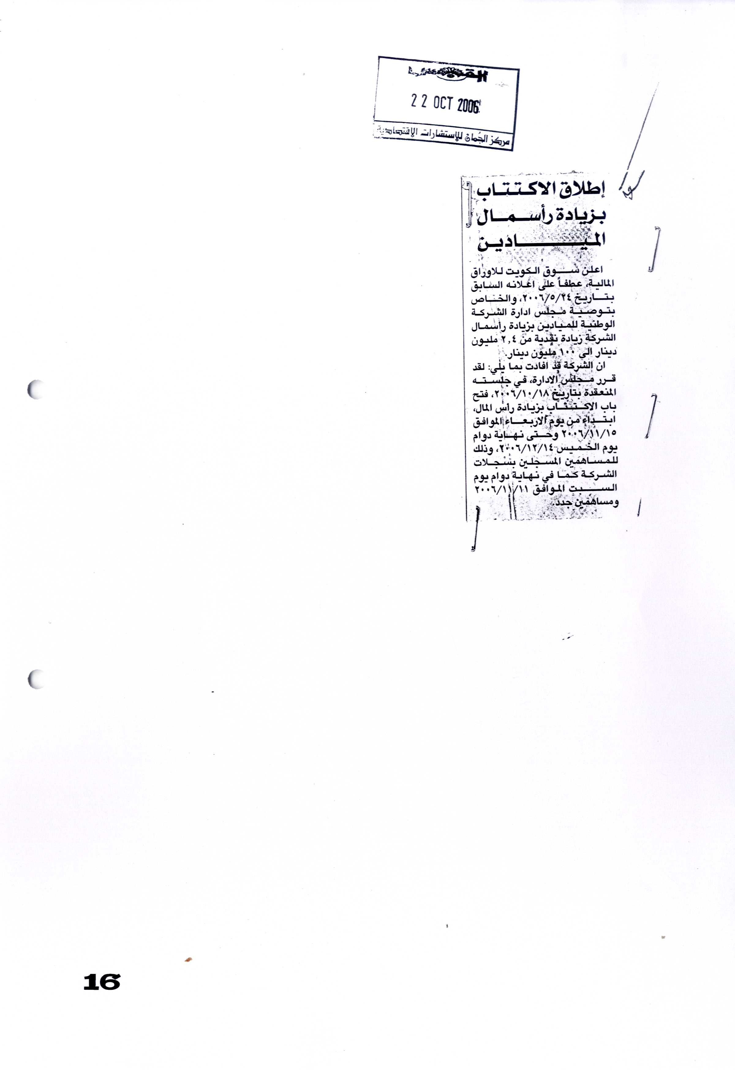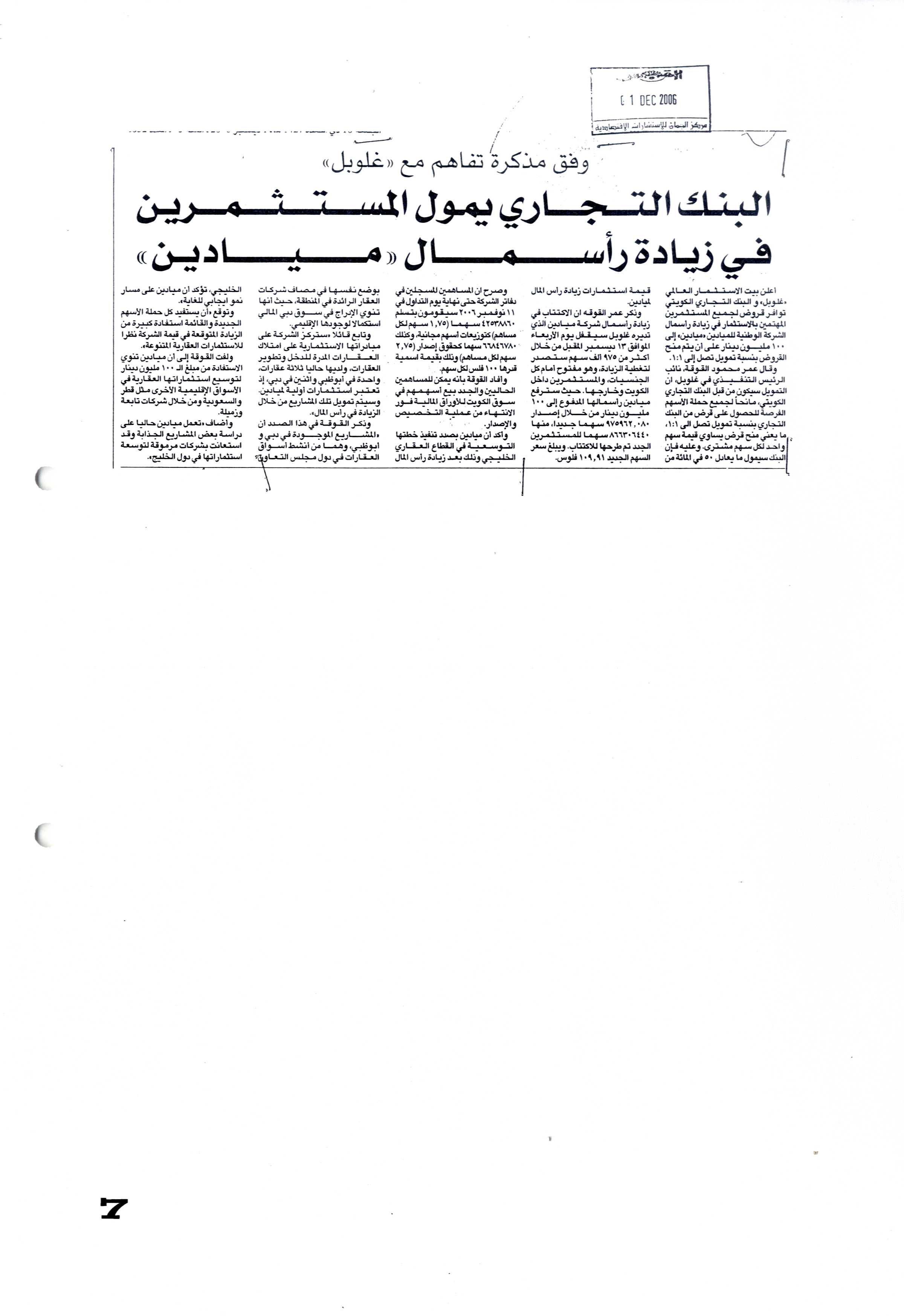 إعلان من "مياديـــن" عن بدء الإكتتاب في أسهم زيادة رأس المال يوم 2006/11/15