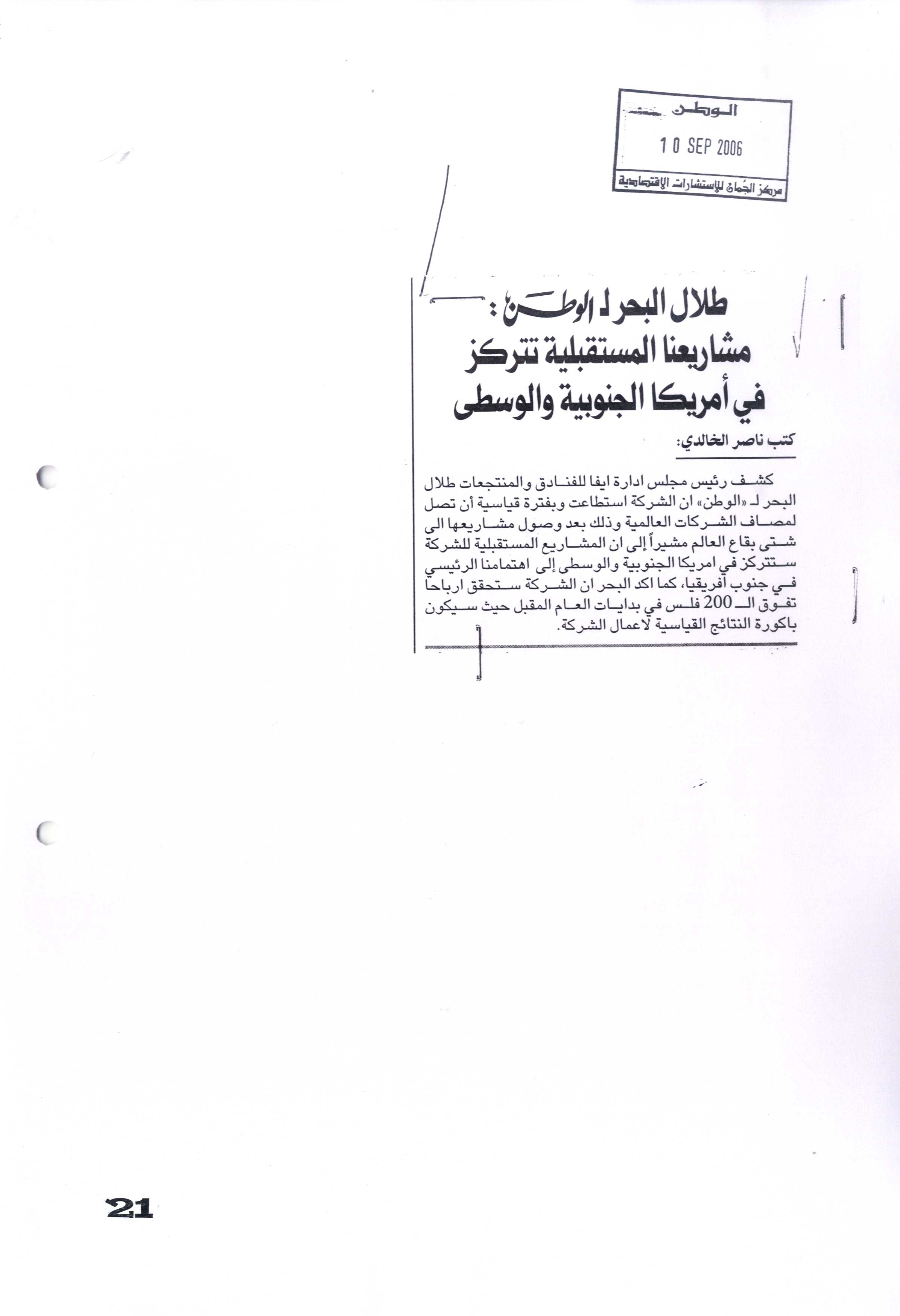 طلال البحر لـ "الوطن" : نتوقع أرباحاً قياسية لـ "إيفا فنـــــادق" تصل إلى 240 فلساً للسهم بداية 2007