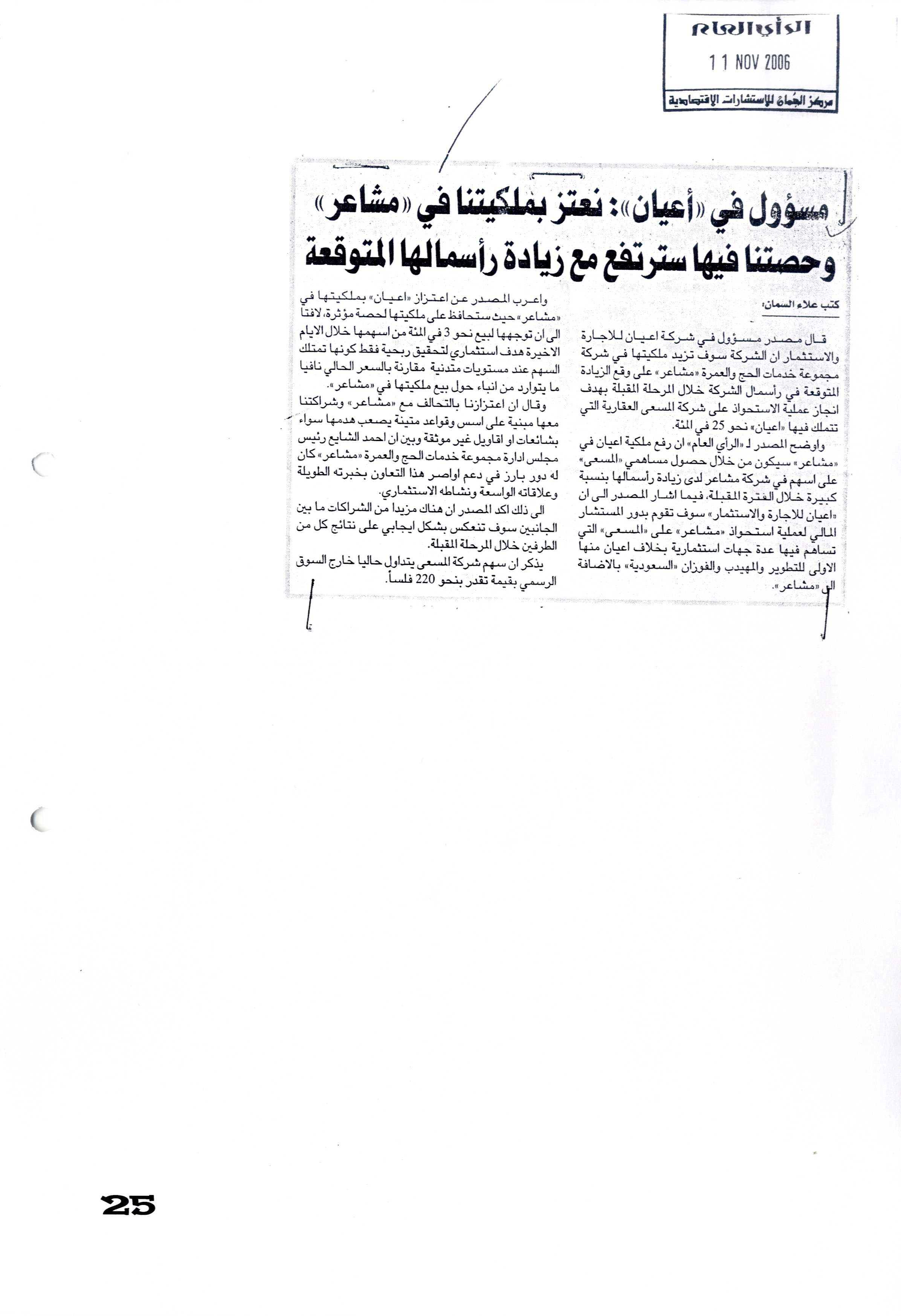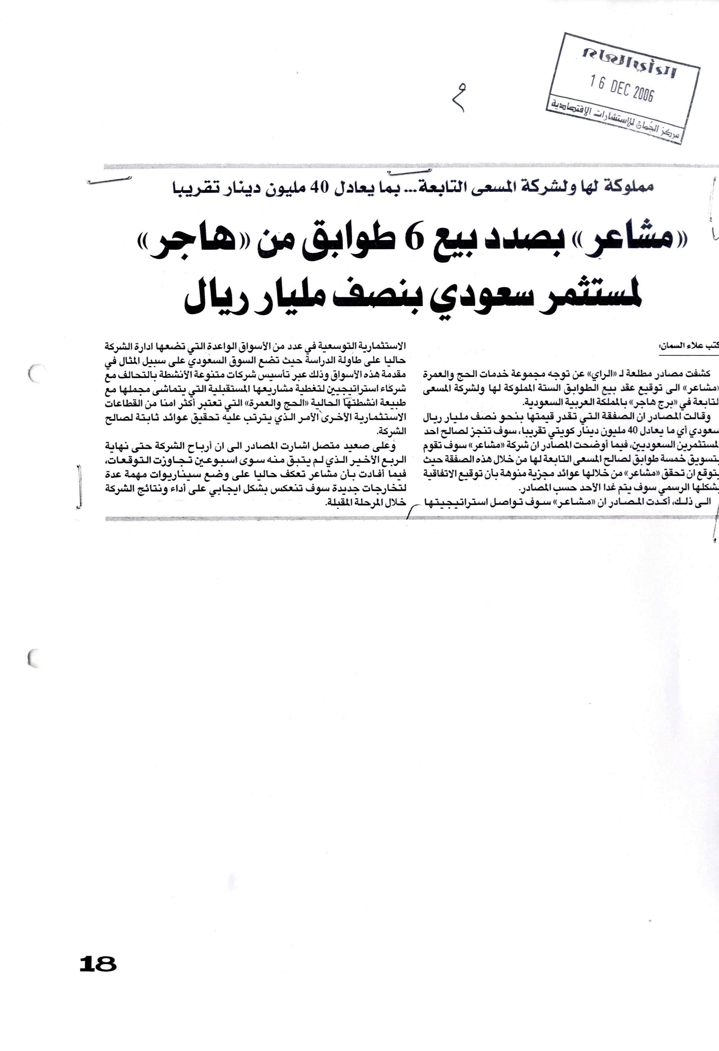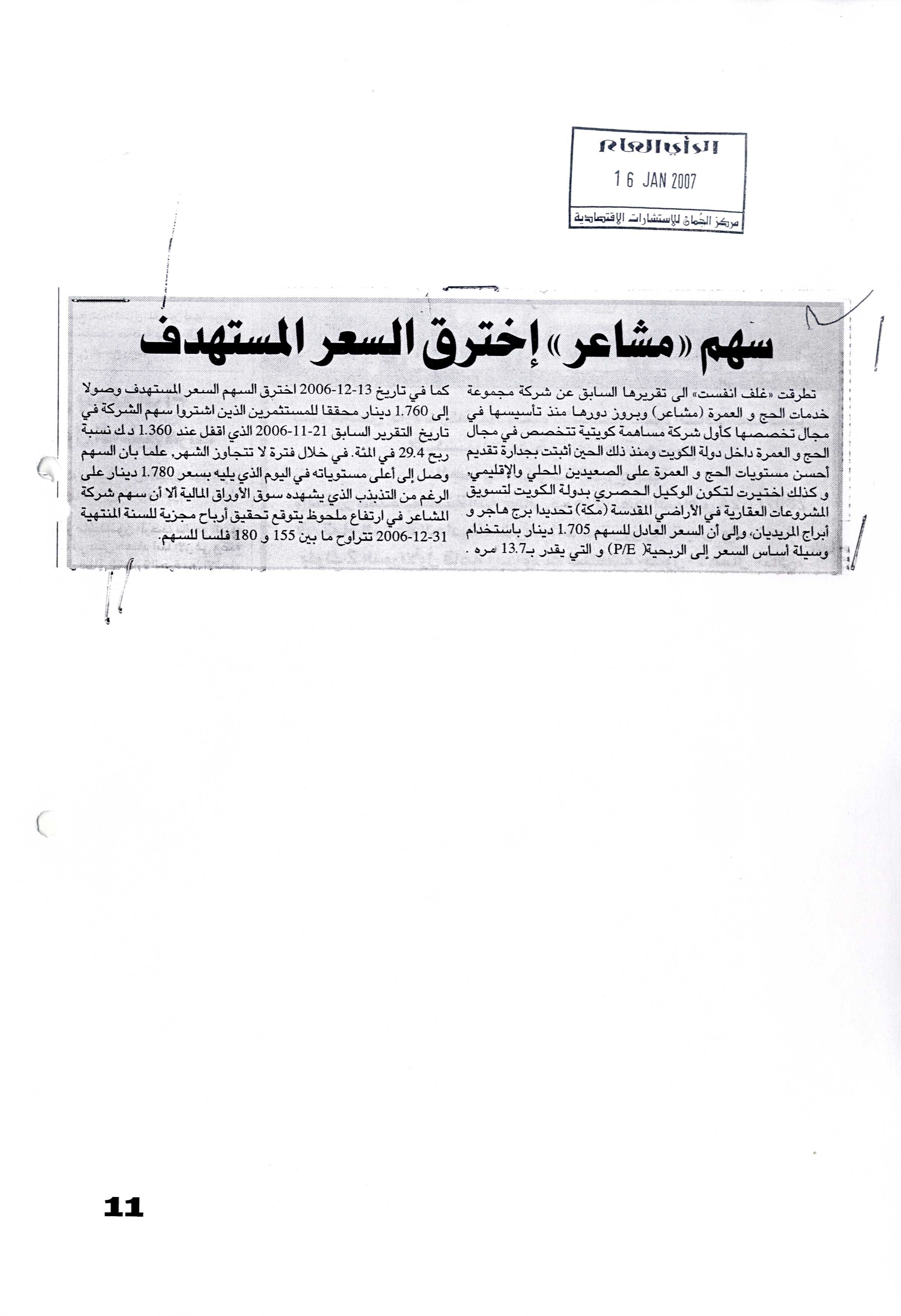 فهرس أرشيف أخبار "شركة مشاعر القابضة" في بعض الصحف المحلية خلال الفترة من 10 أكتوبر 2006 إلى 18 فبراير 2007