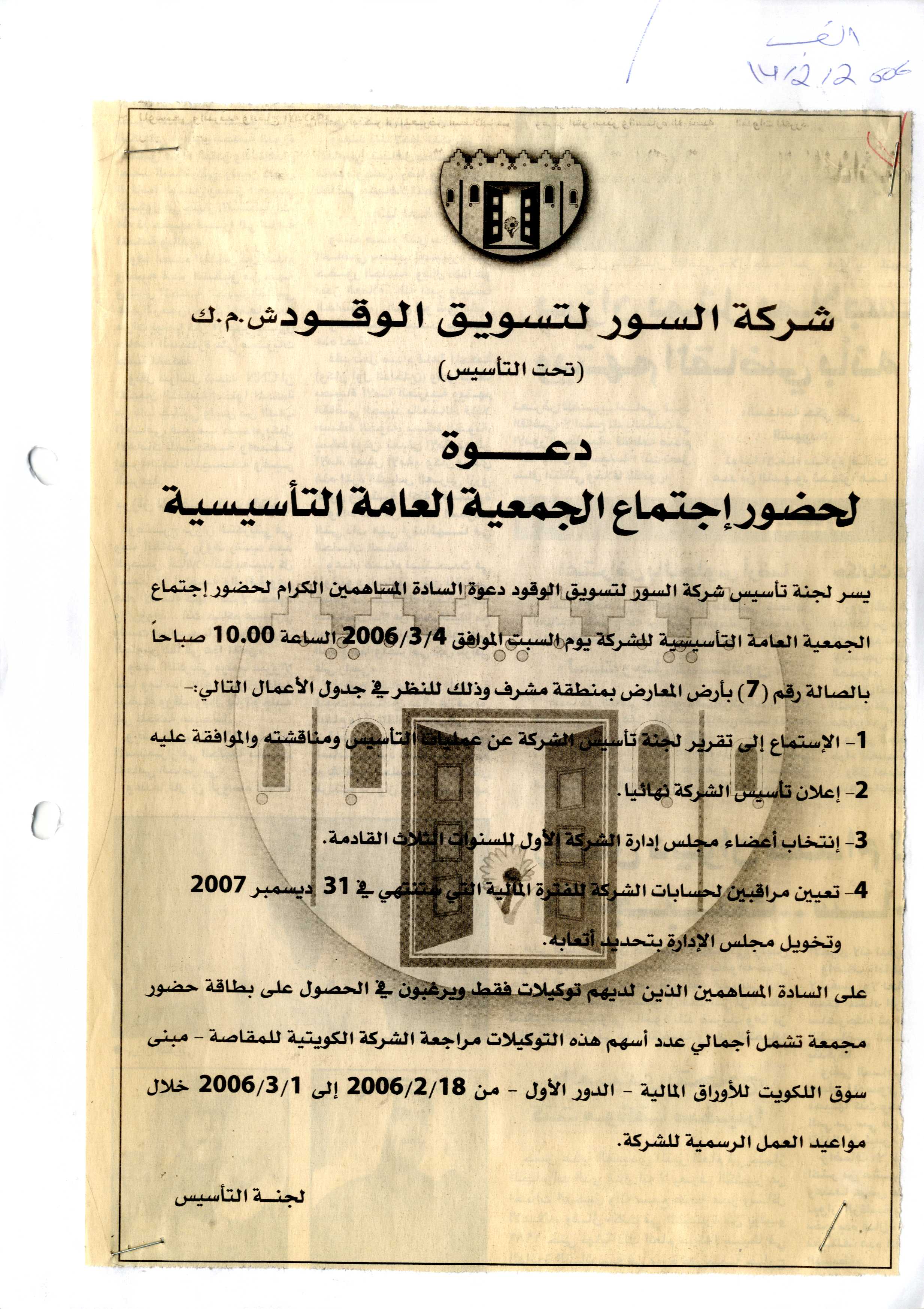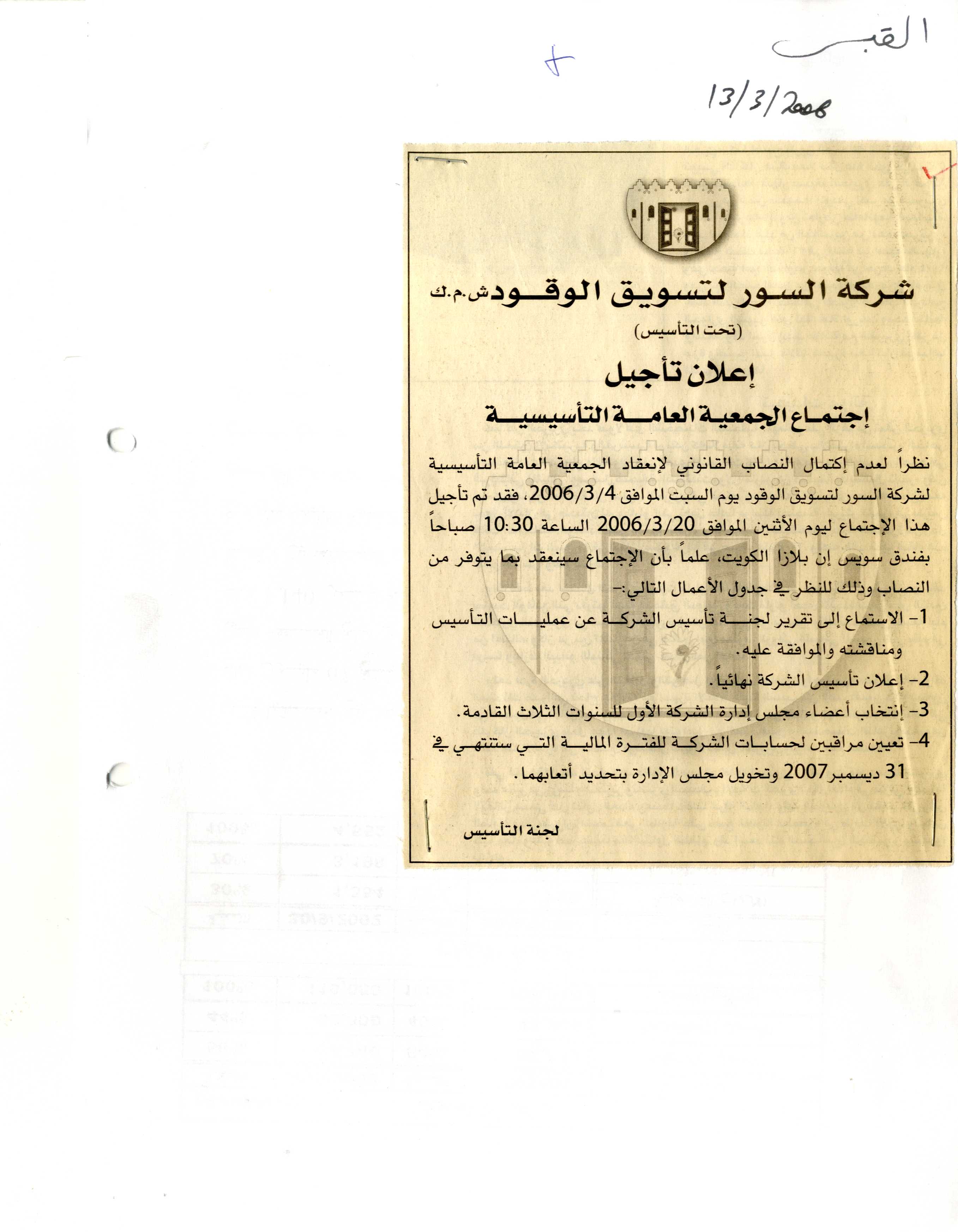 إعلان تأجيل اجتماع الجمعية العامة التأسيسية ليوم 2006.03.20