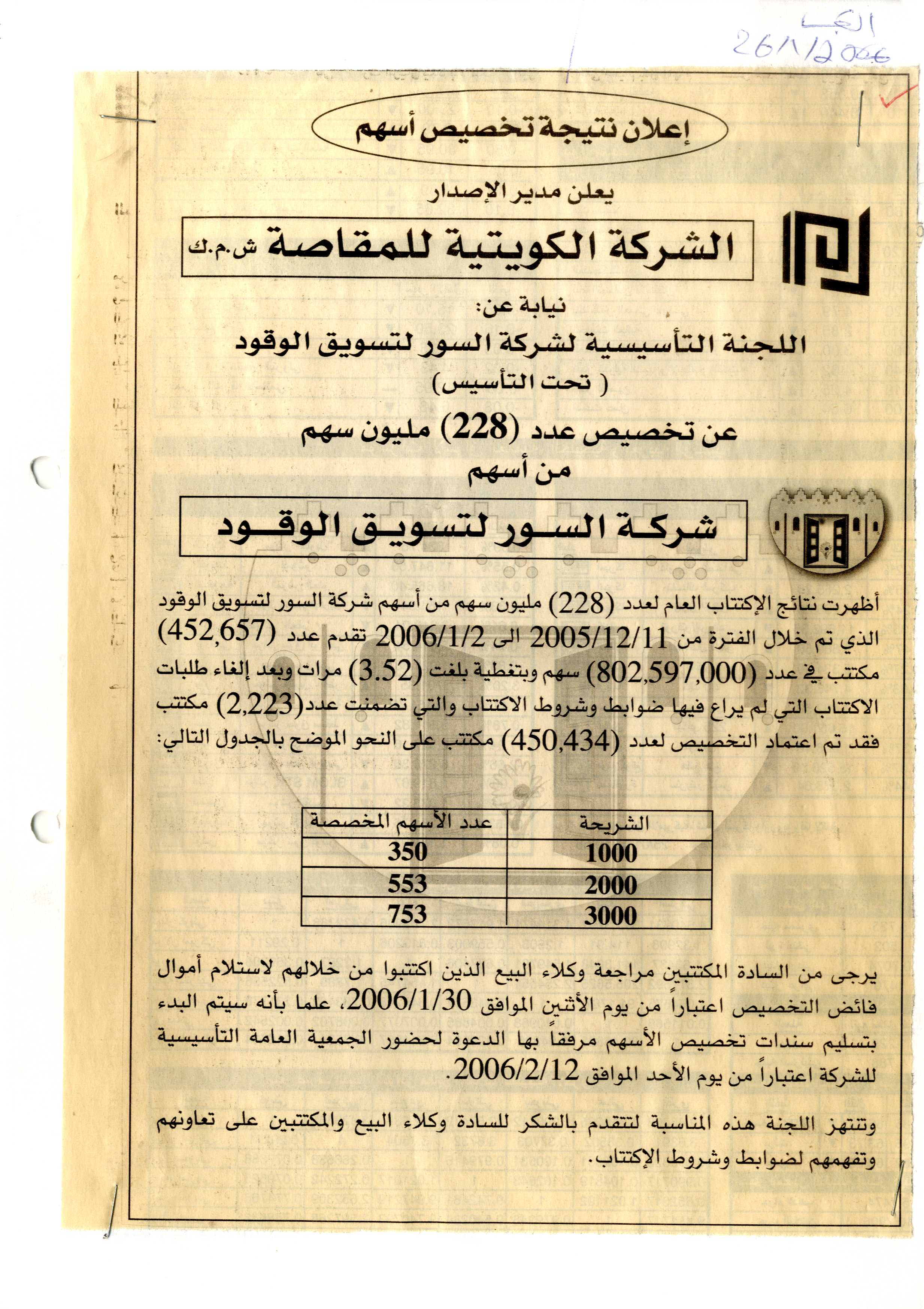 الشركة الكويتية للمقاصة تعلن عن نتيجة تخصيص عدد 228 مليون سهم من أسهم " السور " - (تحت التأسيس) نيابة عنها
