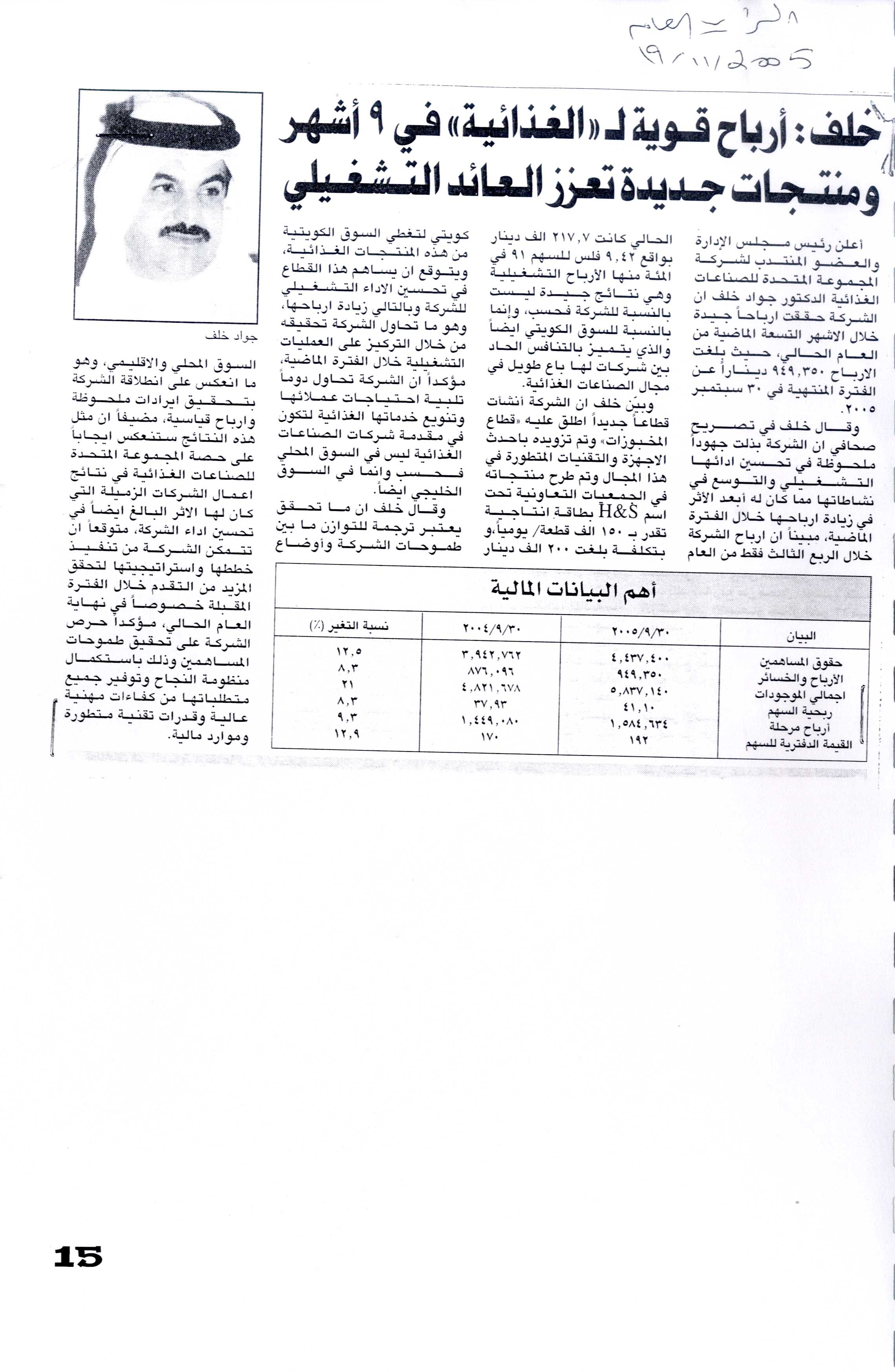 41.1 فلساً لـ "الغذائيـــــة" في التسعة أشهر المنتهية في 2005.09.30